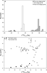 We thank Assistant Prof. John Cliff and Prof. Matt Kilburn for generously sharing their pyrite reference material and Ms. Hong-xia Ma for her help with microanalytical sample preparation. Dr. Shu-Guang Hua and Mr. Ji-Xiang Sui provided help in the field. The manuscript benefited from detailed and constructive reviews by two anonymous reviewers, which are gratefully appreciated. We thank Profs. Rui-zhong Hu (AE) and Bernd Lehmann (Editor-in-Chief) for editorial handling and useful suggestions. This research was supported by the National Natural Science Foundation of China (Grants 41303008, 41325007, 41203016, 41072057), China Postdoctoral Science Foundation (2013 M541034), National Basic Research Program of China (2014CB440906), the Fundamental Research Funds for the Central Universities (N120401002), and the State Key Laboratory of Lithospheric Evolution, IGG-CAS.