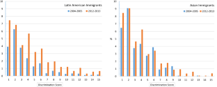 Rates of perceived discrimination increased by more than 80 percent among immigrants from Latin America (from 14% in 2004 to 25% in 2013), but remained unchanged among Asian immigrants (20–22%). Large percentage point (pp) increases were observed among Latin American immigrants with less than a high school education (pp increase = 13.5) and residing in households earning $20-35,000 annually (pp increase = 14.0).