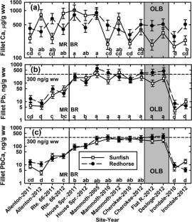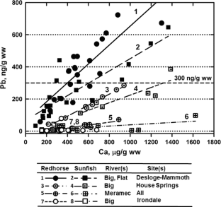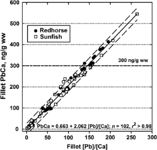 Lead (Pb) and calcium (Ca) concentrations were measured in fillet samples of longear sunfish (Lepomis megalotis) and redhorse suckers (Moxostoma spp.) collected in 2005–2012 from the Big River, which drains a historical mining area in southeastern Missouri and where a consumption advisory is in effect due to elevated Pb concentrations in fish. Lead tends to accumulated in Ca-rich tissues such as bone and scale. Concentrations of Pb in fish muscle are typically low, but can become elevated in fillets from Pb-contaminated sites depending in part on how much bone, scale, and skin is included in the sample. We used analysis-of-covariance to normalize Pb concentration to the geometric mean Ca concentration (415 ug/g wet weight, ww), which reduced variation between taxa, sites, and years, as was the number of samples that exceeded Missouri consumption advisory threshold (300 ng/g ww). Concentrations of Pb in 2005–2012 were lower than in the past, especially after Ca-normalization, but the consumption advisory is still warranted because concentrations were >300 ng/g ww in samples of both taxa from contaminated sites. For monitoring purposes, a simple linear regression model is proposed for estimating Ca-normalized Pb concentrations in fillets from Pb:Ca molar ratios as a way of reducing the effects of differing preparation methods on fillet Pb variation.