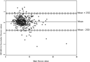 Overall, the mean difference (bias) was 0.12 mmol/l (2.15 mg/dl) and precision 0.77 mmol/l (13.8 mg/dl); 95% limits of agreement were −0.14 and 1.66 mmol/l (−2.5 and 29.8 mg/dl). In patients with systemic hypoperfusion the bias was 0.24 mmol/l (4.0 mg/dl) and precision 0.9 mmol/l (16.2 mg/dl); 95% limits of agreement −2.05 and 1.58 mmol/l (36.8 and 28.4 mg/dl).