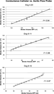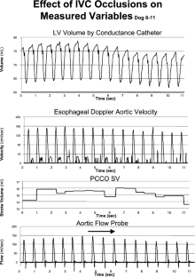 In a university research facility we compared beat-to-beat changes in stroke volume as measure by aortic root flow probe or conductance catheter to pulse contour analysis and stroke distance as measured by esophageal Doppler.