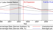 Nevertheless, to date no study has examined whether and how one spouse’s unemployment causally affects the other partner’s subjective well-being.Footnote 8 One related early contribution in the economics literature (Winkelmann and Winkelmann 1995) has studied cross-spousal spillovers in life satisfaction due to unemployment. Specifically, using GSOEP data for West Germany for 1984–1989, Winkelmann and Winkelmann (1995) show one regression table whereby in addition to controlling for one’s own unemployment status, the authors also include indicators for the partner’s employment status.Footnote 9 The study shows that conditional on one’s own unemployment, partners’ unemployment reduces female life satisfaction by 0.5 points (on a 0–10 scale). Men do not experience additional declines in life satisfaction above and beyond their own unemployment. While the Winkelmann and Winkelmann (1995) work is important in highlighting the within-couple externalities of unemployment, it relies on data only from West Germany from the late-1980s and does not differentiate between voluntary and involuntary unemployment entry. Specifically, own life satisfaction or the life satisfaction of the spouse may be correlated with the unemployment entry, thus biasing upwards the coefficient estimates in Winkelmann and Winkelmann (1995).