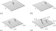 Table 3 and Fig. 7 show the results of three optimization runs, displayed on the full 10 m-by-10 m plate. In all three cases, the maximum beam width is \({\bar{b}}=0.12\)m. Runs #1 and #2 are with a total depth of \({\bar{H}}=0.35\)m whereas run #3 is with \({\bar{H}}=0.40\)m. Accordingly, \(\underline{t}=0.07\)m in runs #1 and #2 and \(\underline{t}=0.08\)m in run #3. Finally, run #1 applies sizing to the beam widths while runs #2 and #3 include a SIMP penalty to promote a uniform cross-section of all beams.