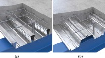 where \({\textbf{T}}\) is a 12-by-12 matrix with entries \({\textbf{T}}_{1,5} = -{\textbf{T}}_{2,4} = {\textbf{T}}_{7,11} = -{\textbf{T}}_{8,10} = e\) and zeros otherwise. These entries reflect the coupling between displacements of the beam in parallel to the plate’s plane and rotations of the plate’s plane. Finally, the beam stiffness matrix in global coordinates is computed by applying the operator \({\textbf{R}}\) that accounts for the relative rotation between the local and global coordinate systems,
