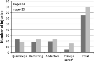 The aim of this study was to make a comparison between players in two age groups in an elite male soccer team regarding injury localisation within the muscle–tendon unit, injury size and muscle group in terms of muscle injuries of the lower extremity.