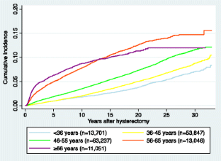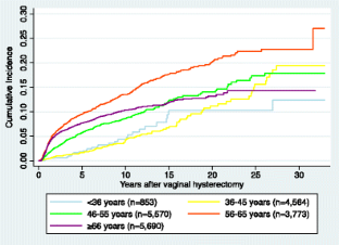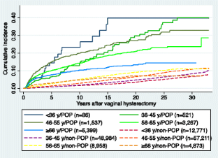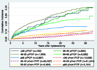 We gathered data on all benign hysterectomies and POP surgeries performed in Denmark on Danish women from 1977 to 2009 from the Danish National Patient Registry. The cohort consisted of 154,882 hysterectomized women, who were followed up for up to 32 years. Survival analysis for each age group at hysterectomy was performed using Kaplan–Meier product limit methods.