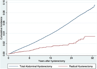 From the Danish National Patient Registry, we collected data on all radical hysterectomies, all total abdominal hysterectomies, and all POP operations performed in Denmark from 1 January 1977 to 31 December 2009. We excluded patients with prior POP repair, POP diagnosis, or concomitant POP repair at hysterectomy. We analyzed the incidence of POP surgery using Kaplan–Meier curves and hazard ratio (HR).