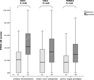One hundred twenty-six patients completed all questionnaires. Internal consistency, measured by Cronbach’s alpha value, was good, and the test–retest reliability was high, with an intraclass correlation coefficient (ICC) of 0.99. Construct validity was verified by factor analysis. All assumptions were confirmed, and there were no ceiling or floor effects in this study. Spearman’s correlation coefficient between the PFDI-20 and the Pelvic Floor Impact Questionnaire (PFIQ-7) was 0.867, showing a significant correlation. Furthermore, the minimal important change (MIC) of 50.0 was less than the smallest detectable change (SDC) of 18.36, indicating the sufficient responsiveness.
