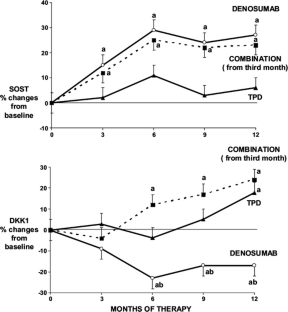 In the groups treated only with TPTD or with denosumab, bone turnover markers increased and decreased, respectively. In TPTD group, a later significant increase in DKK1 was observed, while in denosumab group, a progressive increase in SOST was associated with a progressive significant decrease in DKK1.