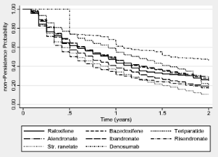 A total of 19,253 women were included. Unadjusted 2-year persistence [95% CI] ranged from 10.3% [9.1–11.6%] (strontium ranelate) to 45.4% [43.1–47.8%] (denosumab). One-year persistence went from 35.8% [33.9%–37.7%] (strontium ranelate) to 65.8% [63.6%–68.0%] (denosumab). At the end of the first year and compared to alendronate users, both teriparatide and denosumab users had reduced cessation risk (adjusted HR 0.76, 95% CI 0.67–0.86 and 0.54, 95% CI 0.50–0.59 respectively) while at the end of the second year, only denosumab had a lower risk of discontinuation (adjusted HR 0.60, 95% CI 0.56–0.64).