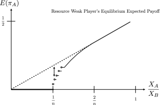 and the equilibrium expected payoffs are \(\frac{X_A}{2X_B}\) for player A and \(1-\frac{X_A}{2X_B}\) for player B.
