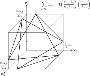 Because \(X_{A,j}^*=\frac{v_{B,j}}{2\lambda _{B}^* }\) and \(X_{B,j}^*=\frac{\left( v_{B,j}/2\lambda _{B}^* \right) ^2}{\left( v_{A,j}/2\lambda _{A}^* \right) }\) when \(X_{A,j}^* >X_{B,j}^*\), and \(X_{A,j}^*=\frac{\left( v_{A,j}/2\lambda _{A}^* \right) ^2}{\left( v_{B,j}/2\lambda _{B}^* \right) }\) and \(X_{B,j}^*=\frac{v_{A,j}}{2\lambda _{A}^*}\) when \(X_{A,j}^* \le X_{B,j}^*\), it follows that \(\frac{v_{A,j}}{\lambda _{A}^*} >\frac{v_{B,j}}{\lambda _{B}^*}\) if and only if \(X_{A,j}^* >X_{B,j}^*\). Thus, the system (22) and (23) is equivalent to system (\(\star \)).