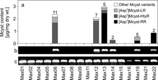 This study was financially supported by Deutsche Forschungsgemeinschaft (DFG, grant no. Do 270/10). We thank Torsten Schwecke and Karina Preuβel for assistance with cultivation of the strains and PCR work. Jutta Fastner, UBA, kindly provided Mcyst standards. Comments on MS and PSD data by Marcel Erhard, AnagnosTec Luckenwalde, are gratefully acknowledged. Further, we want to thank Rosmarie Rippka, Institut Pasteur, for assistance in our—unfortunately unsuccessful—attempts at the axenization of strains and two anonymous reviewers for useful comments on an earlier draft of the manuscript.