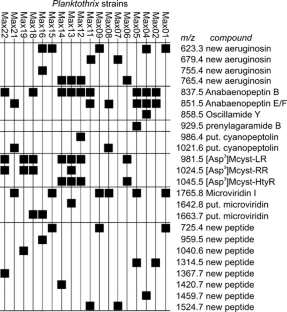 Cyanobacteria are reported to produce secondary metabolites of which toxic and bioactive peptides are of scientific and public interest. Many peptides are synthesized by the non-ribosomal peptide synthesis pathway and their presence is a stable feature of individual clones. We isolated 18 clonal strains of Planktothrix from a single water sample from lake Maxsee near Berlin and analyzed them by matrix-assisted laser desorption/ionization time-of-flight mass spectrometry, HPLC, and PCR for their production of peptides and the presence of microcystin synthetase genes. Microcystins could be detected in seven of the strains with considerable variability of contents and numbers of structural variants. Other known peptides like anabaenopeptins B and E/F, microviridin I, and prenylagaramide B and new variants of known peptide classes like aeruginosins and cyanopeptolins were detected in some strains while lacking in others. The 18 strains represented 15 chemotypes with respect to their peptide patterns. In contrast, all strains were morphologically very similar with respect to cell dimensions and pigmentation. Given the diversity of chemotypes among the randomly selected isolates, an immense diversity of chemotypes in the entire population can be assumed.