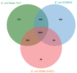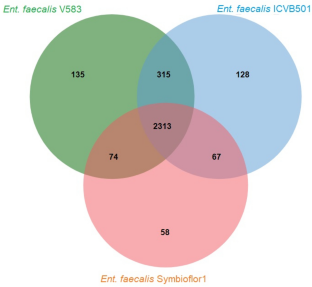 Here, we have analysed and explored the genome sequences of three newly isolated bacteria that were recently characterised for their probiotic activities and ability to produce bacteriocins. These strains, isolated from faeces of animals living in captivity at the zoological garden of Lille (France), are Escherichia coli ICVB443, Enterococcus faecalis ICVB501 and Pediococcus pentosaceus ICVB491. Their genomes have been analysed and compared to those of their pathogenic or probiotic counterparts. The genome analyses of E. coli ICVB443 and Ent. faecalis ICVB501 displayed similarities to those of probiotics E. coli 1917 Nissle, and Ent. faecalis Symbioflor 1, respectively. Furthermore, E. coli ICVB443 shares at least 89 genes with the enteroaggregative E. coli 55989 (EAEC), and Ent. faecalis ICVB501 shares at least 315 genes with the pathogenic Ent. faecalis V583 strain. Unlike Ped. pentosaceus ICVB491, which is devoid of virulence genes, E. coli ICVB443 and Ent. faecalis ICVB501 both carry genes encoding virulence factors on their genomes. Of note, the bioinformatics analysis of these two genomes located the bsh gene, which codes for bile salt hydrolase (BSH). The presence of BSH is of major importance, as it can help to increase the viability of these two strains in the gastrointestinal tract (GIT). The genome analysis of Ped. pentosaceus ICVB491 confirmed its GRAS status (Generally Recognised As Safe), as no genomic virulence factor determinant was found.