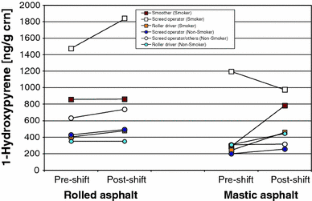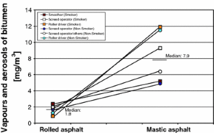 Rühl R, Musanke U, Kolmsee K, Prieß R, Zoubek G, Breuer D (2006) Vapours and aerosols of bitumen: exposure data obtained by the German Bitumen Forum. Ann Occup Hyg 50:459–468