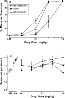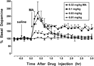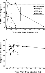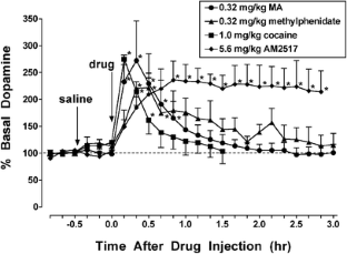 MA, cocaine and methylphenidate produced dose-related increases in responding on the MA-associated lever and fully substituted at higher doses. In microdialysis studies, doses of MA, cocaine, methylphenidate, and AM2517 that produced 100% MA-lever responding produced comparable increases in caudate dopamine (to approximately 250% of control values). However, comparable increases in extracellular dopamine also were observed following a lower dose of MA (0.1 mg/kg) that produced, on average, 42% MA-lever responding. Moreover, increases in dopamine levels following administration of 0.03 and 0.1 mg/kg MA persisted after responding on the MA-associated lever had subsided.