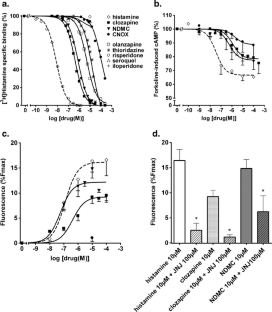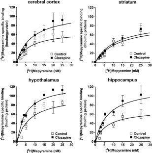 Clozapine and NDMC behaved as very potent, and partial, H1-receptor inverse agonists, weak, and full, H2-receptor inverse agonists, moderate, and protean, H3-receptor agonists, and moderate, and partial, H4-receptor agonists. Taking into account their micromolar mean blood concentrations found in 75 treated patients, and assuming that they are enriched in human brain as they are in rat brain, a full occupation of H1-, H3-, and H4-receptors, and a partial occupation of H2 receptors, is expected. In agreement, repeated administration of clozapine at a therapeutic dose (20 mg/kg/day for 20 days) induced an up-regulation of H1- and H2-receptors in rat brain.