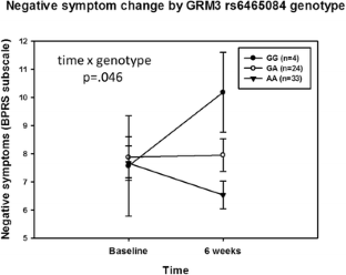Type-3 metabotropic glutamate receptor gene (GRM3) single nucleotide polymorphisms (SNPs) have been associated with cognitive performance and prefrontal cortex brain activity in chronically treated schizophrenia patients. Whether these SNPs are associated with cognitive and symptom response to antipsychotic therapy has not been extensively evaluated.