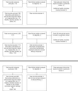 A review of studies conducted since 1991 identified 14 clinical trials of classical psychedelics, including 11 of psilocybin (N = 257 participants), 1 of lysergic acid diethylamide (N = 12 participants), and 2 of ayahuasca (N = 46 participants). Other published studies (e.g., of healthy volunteers, survey studies, case reports, neuroimaging) were also considered for review.