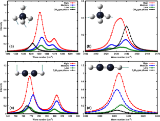Periodic boundary conditions as implemented within a linear combination of atomic orbital approach are applied to determine the infrared spectra of methane, acetylene, ethylene, and ethane in MOF-74-Mg. Intensities and frequency shifts with respect to the molecules in the gas phase are described and discussed with respect to geometrical arrangements and structural modifications of the molecules adsorbed in the framework. Given the predictive nature of the work and in the attempt of providing a better ground for comparison with experimental spectroscopic observations, different molecular loadings are considered where one (low loading), three (medium loading), and six (full loading) molecules are adsorbed at the primary adsorption binding site identified by the MgO5 inorganic brick of the MOF structure. In addition, enthalpies of adsorption are reported for methane and acetylene whose addition to previous works by the same authors, provides an overall assessment at electronic structure level of the energetic behavior of C1–C4 hydrocarbons in MOF-74-Mg. Calculations are conducted at B3LYP-D2* level of theory as implemented in the Crystal14 program.