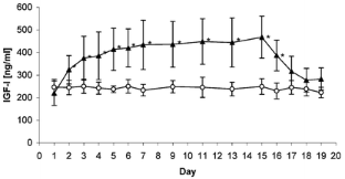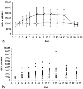 The concentrations of the following markers were determined in relevant serum samples: IGF-I, IGFBP-3, ALS, PIIINP, PINP, osteocalcin, and leptin. The IGF-I concentration increased rapidly within the hGH treatment group and showed significantly higher levels compared to baseline even 3 days after application. The response of the IGFBP-3 to the hGH applications was lower in comparison to IGF-I. The hGH group showed an increasing IGFBP-3 compared to baseline from day 4 till day 15. The response of PIIINP to hGH is clearly delayed compared to the IGF-I axis, but the PIIINP concentration remains on an increased level for a longer period (from day 4 until day 21). The time course and the extent of response varied strongly interindividually. PINP and osteocalcin showed only a small response to hGH applications. These parameters are characterised by a strong scattering of base values compared with the small response. In the hGH treatment group very different leptin concentrations were found at the beginning of the study, but after treatment decreasing leptin levels were observed in all cases.