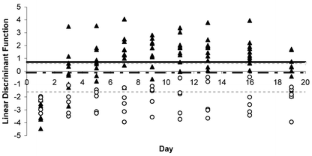 The determination of only one parameter will not be sufficient for detection of hGH abuse. A combination of markers by mathematical methods can be helpful to distinguish between placebo and hGH-treated athletes. By using the suggested discriminant function the data sets of hGH and placebo-treated athletes could be separated without false positive results.