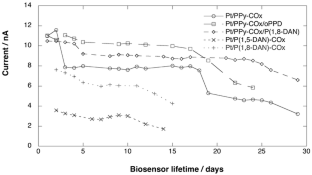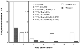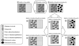 Cholesterol amperometric biosensors constructed with enzymes entrapped in electropolymerized layers of polypyrrole and poly-naphthalene derivative polymers are compared. The biosensors are based on entrapment of cholesterol oxidase and/or cholesterol esterase in monolayer or multilayer films electrochemically synthesised from pyrrole, 1,8-diaminonaphthalene (1,8-DAN), and 1,5-diaminonaphthalene (1,5-DAN) monomers. Seven configurations were assayed and compared, and different analytical properties were obtained depending on the kind of polymer and the arrangement of the layers. The selectivity properties were evaluated for the different monolayer and bilayer configurations proposed as a function of the film permeation factor. All the steps involved in the preparation of the biosensors and determination of cholesterol were carried out in a flow system. Sensitivity and selectivity depend greatly on hydrophobicity, permeability, compactness, thickness, and the kind of the polymer used. In some cases a protective outer layer of non-conducting poly(o-phenylenediamine) polymer improves the analytical characteristics of the biosensor. A comparative study was made of the analytical performance of each of the configurations developed. The biosensors were also applied to the flow-injection determination of cholesterol in a synthetic serum.
