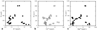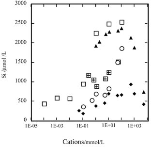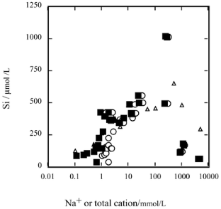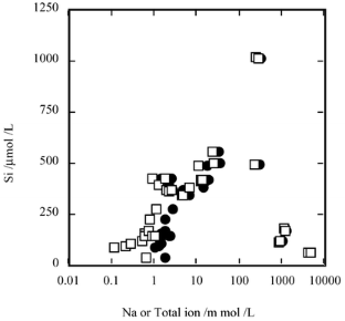 The concentration of silica in water samples from the desert area of Xinjiang, N. W. China, has been measured by colorimetry with ammonium molybdate. The observed pattern of dependence of the concentration of silica on the concentration of sodium ion (Na+) in the water samples is consistent with the pattern obtained by experiments on in-vitro dissolution of silica gel in sodium chloride (NaCl) solution. This indicates that the dissolution of silica in the hydrologic system in this area depends on the concentration of Na+. Calcium ion (Ca2+), which is known to play an important role on the dissolution of silica on the basis of in-vitro experiments, was observed to take little part in the dissolution of silica in actual natural water samples. This implies that the Ca2+ is bound to the hydrogen carbonate anion or that the Ca2+ content of natural water containing salts is very low, owing to precipitation. In these samples silicate-Na+ was identified as the dissolution species of silica; it was also ascertained that Ca2+ did not form complexes with silicate species. These observations resulted from direct identification of dissolved chemical species by use of FAB-MS (fast atom bombardment mass spectrometry). The research indicates that in water samples in this critically arid region the concentration of “dissolved” silica is basically determined by the concentration of Na+, indicative of pure inorganic conditions in the desert area of Xinjiang, N.W. China.