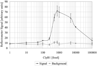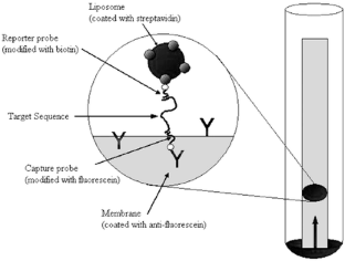 A quantitative and highly sensitive, yet simple and rapid, biosensor system was developed for the detection of nucleic acid sequences that can also be adapted to the detection of antigens. A dipstick-type biosensor with liposome amplification, based on a sandwich assay format with optical detection, was combined with a simple coupling reaction that allows the transformation of the generic biosensor components to target specific ones by a mere incubation step. This biosensor platform system was developed and optimized, and its principle was proven using DNA oligonucleotides that provided a nucleic acid biosensor for the specific detection of RNA and DNA sequences. However, the coupling reaction principle chosen can also be used for the immobilization of antibodies or receptor molecules, and therefore for the development of immunosensors and receptor-based biosensors. The generic biosensor consists of liposomes entrapping sulforhodamine B that are coated with streptavidin on the outside, and polyethersulfone membranes with anti-fluorescein antibodies immobilized in the detection zone. In order to transform the generic biosensor into a specific DNA/RNA biosensor, two oligonucleotides that are able to hybridize to the target sequence were labeled with a biotin and a fluorescein molecule, respectively. By simultaneously incubating the liposomes, both oligonucleotides, and the target sequence in a hybridization buffer for 20–30 min at 42 °C, a sandwich complex was formed. The mixture was applied to the polyethersulfone membrane. The complex was captured in the detection zone and quantified using a handheld reflectometer. The system was tested using RNA sequences from B. anthracis, C. parvum and E. coli. Quantitation of concentrations between 10 fmol and 1000 fmol (10–1000 nM) was possible without altering any biosensor assay conditions. In addition, no changes to hybridization conditions were required when using authentic nucleic acid sequence-based amplified RNA sequences, and the generic biosensor compared favorably with those previously developed specifically for the RNA sequences. Therefore, the universal biosensor described is an excellent tool, for use in laboratories or at test sites, for rapidly investigating and quantifying any nucleic acid sequence of interest, as well as potentially any antigen of interest that can be bound by two antibodies simultaneously.