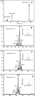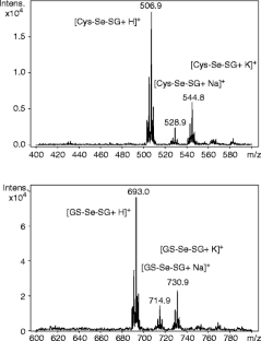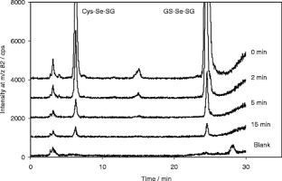 To elucidate how selenite is metabolised in the intestine after oral intake, it was incubated with homogenized epithelial cells from pigs. When the metabolites were analysed by LC–ICP–MS, two major selenium metabolites were separated in the supernatant from the homogenate. These metabolites were formed instantly but disappeared within 15 min. No other selenium-containing compounds appeared during this time. Hence, the secondary reaction products were either volatilised or precipitated. To verify the identity of the compounds, a larger amount of selenite was incubated with epithelial cells. The presence of Cys-Se-SG and GS-Se-SG was verified by LC–ESI-MS. Selenotrisulfides were synthesized by reaction of L-cysteine and L-glutathione with sodium selenite. The reaction mixture contained three main products: selenodicysteine (Cys-Se-Cys), selenocysteine glutathione (Cys-Se-SG), and selenodiglutathione (GS-Se-SG). The two transient selenium compounds in the epithelial cell incubation mixture co-eluted with the synthesized Cys-Se-SG and GS-Se-SG, respectively. The identities of these compounds were verified by LC–ESI-MS. Hence, these selenium metabolites have now been identified by ESI-MS after isolation from epithelial cells.