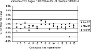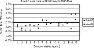 A gas standard reference material (SRM) containing fifteen hydrocarbons in nitrogen at a nominal 5 nmol mol−1 was issued in 1993. The certification period for SRM 1800 was assigned as 2 years, because of limited stability data. Over a period of 10 years reanalysis of the lot standard (a sample chosen from the SRM lot to which all other lot samples are compared), SRM samples remaining in stock for sale, and SRMs returned to the National Institute of Standards and Technology (NIST) for recertification, were compared with primary standards to assess the stability of the hydrocarbons. New primary standards were periodically introduced into the original primary standard suite to assess the stability and consistency of the primary standards. Over this ten-year period 11 SRM 1800 samples were reanalyzed, resulting in 210 amount-of-substance fraction (concentration) determinations performed for quality-assurance purposes. Of these measurements 209 (99.5%) agreed within the original 95% confidence interval of the ±4% expanded uncertainty, demonstrating the stability of the standards. There was also agreement to within ±2% of the original concentration for 204 (97%) of the measurements. This is well within the original ±4% expanded uncertainty assigned to the hydrocarbon concentrations at the approximate 95% confidence interval demonstrating stability. These results will enable the expiry date to be increased for future restock issues of SRM 1800.