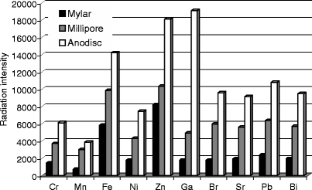 An X-ray fluorescence method (XRF) is presented that allowed low detection limits (at the 0.1–23 ng mL−1 level) to be obtained for Cr, Mn, Fe, Ni, Zn, Sr, Pb, Bi and Br in water. The samples were prepared using a thin layer method. Trace elements were determined via the calibration curve and standard addition. Absorption effects and inhomogenities in prepared samples were checked for using the emission–transmission method and internal standards, respectively. The results from the XRF method were compared with the results from the inductively coupled plasma atomic emission spectrometry method.