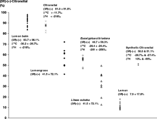 Enantioselective capillary GC on a Supelco β-DEX 225 column (heptakis(2,3-di-O-acetyl-6-O-tert-butyldimethylsilyl)-β-cyclodextrin SPB 20poly—20% diphenyl, 80% dimethylsiloxane) and isotope-ratio mass spectrometry, coupled online with capillary GC on an HP5 column have been used for origin-specific analysis and authenticity control of essential oils, for example lemon (Citrus limon), lemongrass (Cymbopogon citratus and Cymbopogon flexuosus), citronella (Cymbopogon nardus L.—Ceylon type and Cymbopogon winterianus—Java type), Litsea cubeba, Lippia citriodora, lemon myrtle (Backhousia citriodora), lemon gum (Eucalyptus citriodora), and, especially, precious lemon balm oil (Melissa officinalis L.). Isotope data (δ13CPDB and δ2HV-SMOW) for citral (neral + geranial) and citronellal from on-line GC–C/Py–IRMS and chiral data for citronellal in these essential oils are reported. The possibility of using these data to determine the origin of these essential oils and to detect adulteration is discussed. Principal-components analysis (PCA) of specific compounds in two essential oils of lemongrass and Litsea cubeba was performed as a practical statistical method for distinguishing between these two types of oil.