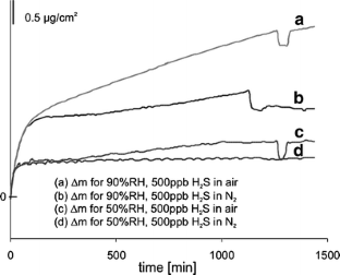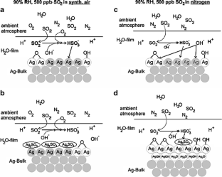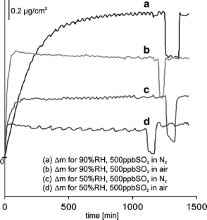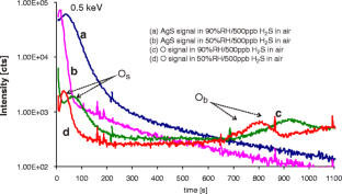Silver-coated quartz crystal microbalance (QCM) disks were treated under different environmental conditions (including changes in parameters such as relative humidity (%RH) and SO2/H2S content) in atmospheres of synthetic air and pure N2 for 24 h in a weathering chamber. The corroded surfaces were subjected to depth profiling by a time of flight (TOF) secondary ion mass spectrometry (SIMS) instrument, equipped with a Bi+ analysis gun and Cs+ sputter gun. The evaluation of the in-depth distribution of several elements and species provides evidence for the formation of a corrosion layer containing Ag2SO3, even in the absence of oxidizing agents, such as H2O2 or NO2. Furthermore it could be elucidated that the thickness of the formed Ag2SO3 layer does not depend on the SO2 concentration but rather on the humidity and oxygen content of the ambient atmosphere. In weathering experiments in atmospheres composed of synthetic air, humidity, and H2S, the presence of different oxygen species (surface and bulk) and silver sulfide could be detected by TOF-SIMS depth profiling experiments. The obtained results for both acidifying gases are in good correlation with the corresponding tapping mode atomic force microscopy (TM-AFM) investigations and in situ QCM measurements.