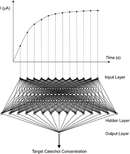 An electrochemical biosensor based on the immobilization of laccase on magnetic core-shell (Fe3O4–SiO2) nanoparticles was combined with artificial neural networks (ANNs) for the determination of catechol concentration in compost bioremediation of municipal solid waste. The immobilization matrix provided a good microenvironment for retaining laccase bioactivity, and the combination with ANNs offered a good chemometric tool for data analysis in respect to the dynamic, nonlinear, and uncertain characteristics of the complex composting system. Catechol concentrations in compost samples were determined by using both the laccase sensor and HPLC for calibration. The detection range varied from 7.5 × 10–7 to 4.4 × 10–4 M, and the amperometric response current reached 95% of the steady-state current within about 70 s. The performance of the ANN model was compared with the linear regression model in respect to simulation accuracy, adaptability to uncertainty, etc. All the results showed that the combination of amperometric enzyme sensor and artificial neural networks was a rapid, sensitive, and robust method in the quantitative study of the composting system.