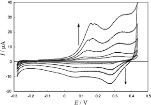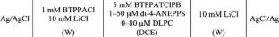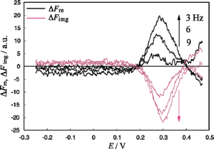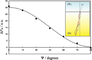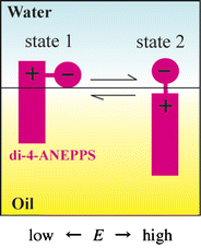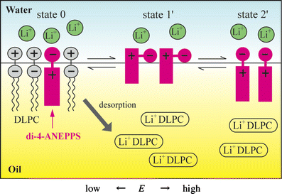 The spectrofluorometric behavior of a membrane potential-sensitive dye, 1-(3-sulfonatopropyl)-4-[β-{2-(di-N-butylamino)-6-naphthyl}vinyl]pyridinium betaine (di-4-ANEPPS), at the polarized 1,2-dichloroethane/water interface was studied by means of potential-modulated fluorescence (PMF) spectroscopy. The results, combined with those from cyclic and alternating current voltammetry, clearly suggested that the dye adsorbed at the interface underwent a reorientation with increasing the interfacial potential, giving a well-developed PMF response as well as a voltammetric response. In addition to the PMF response, another PMF response was observed by addition of dilauroyl phosphatidylcholine (DLPC). This additional response was well explained in terms of a reorientation of di-4-ANEPPS at the interface, which would be induced by the potential-dependent desorption of DLPC from the interface. Thus, the present study supported the reorientation/solvatochromic mechanism for the membrane potential-sensitive dye rather than the electrochromic mechanism.
