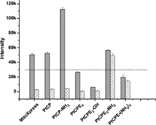 Several new derivatives of the phosphorescent Pt(II)-coproporphyrin (PtCP) were evaluated with respect to the sensing of intracellular oxygen by phosphorescence quenching. Despite the more favorable molecular charge compared to PtCP, self-loading into mammalian cells was rather inefficient for all the dyes, while cell loading by facilitated transport using transfection reagents produced promising results. The PtCP-NH2 derivative, which gave best loading efficiency and S/N ratio, was investigated in detail including the optimisation of loading conditions, studies of sub-cellular localization, cytotoxicity, oxygen sensitivity and long-term signal stability. Being spectrally similar to the macromolecular MitoXpress™ probe currently used in this application, the PtCP-NH2 demonstrated higher loading efficiency and phosphorescent signals, suitability for several problematic cell lines and a slightly increased lifetime scale for the physiological range (0–200 μM O2). In physiological experiments with different cell types, mitochondrial uncouplers and inhibitors performed on a time-resolved fluorescence plate reader, this probe produced the anticipated profiles of intracellular oxygen concentration and responses to cell stimulation. Therefore, PtCP-NH2 represents a convenient probe for the experiments and applications in which monitoring of cellular oxygen levels is required.