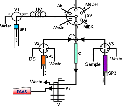 A novel, automatic on-line sequential injection dispersive liquid–liquid microextraction (SI-DLLME) method, based on 1-hexyl-3-methylimidazolium hexafluorophosphate ([Hmim][PF6]) ionic liquid as an extractant solvent was developed and demonstrated for trace thallium determination by flame atomic absorption spectrometry. The ionic liquid was on-line fully dispersed into the aqueous solution in a continuous flow format while the TlBr