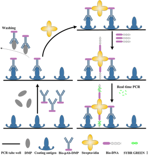 Dimethyl phthalate (DMP), one family of the phthalic acid diesters (PAEs), is an increasing widely used plasticizer. A sensitive and high-throughput direct competitive biotin–streptavidin-amplified system based on real-time immune-PCR (BA-rt-IPCR) techniques was developed for detecting DMP in beverage and drinking water samples. In our assay, we selected dimethyl 4-aminophthalate as the optimal DMP hapten to prepare high titer of rabbit polyclonal anti-DMP antibodies (pAb-DMP). Under the optimized conditions, the proposed method was used to detect DMP with a linearity range from 10 to 100 ng L−1, and the limit of detection (LOD) was 1.98 pg L−1. Finally, the results about DMP in beverage and drinking water samples were consistent with those using gas chromatography–mass spectrometry (GC-MS), which proved that the proposed immunoassay for detecting DMP in the environment was accurate, reliably rapid, and receptive.
