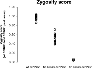 Pancreatic secretory trypsin inhibitor Kazal type 1 (SPINK1) is a 6420 Da peptide produced by the pancreas, but also by several other tissues and many tumors. Some mutations of the SPINK1 gene, like the one causing amino acid change N34S, have been shown to confer susceptibility to recurrent or chronic pancreatitis. Detection of such variants are therefore of clinical utility. So far SPINK1 variants have been determined by DNA techniques. We have developed and validated an immunocapture-liquid chromatography-mass spectrometric (IC-LC-MS) assay for the detection and quantification of serum SPINK1, N34S-SPINK1, and P55S-SPINK1. We compared this method with a time-resolved immunofluorometric assay (TR-IFMA) for serum samples and primer extension analysis of DNA samples. We used serum and DNA samples from patients with acute pancreatitis, renal cell carcinoma, or benign urological conditions. With the help of a zygosity score calculated from the respective peak areas using the formula wild-type (wt) SPINK1/(variant SPINK1 + wt SPINK1), we were able to correctly characterize the heterozygotes and homozygotes from the samples with DNA information. The score was then used to characterize the apparent zygosity of the samples with no DNA characterization. The IC-LC-MS method for SPINK1 was linear over the concentration range 0.5–1000 μg/L. The limit of quantitation (LOQ) was 0.5 μg/L. The IC-LC-MS and the TR-IFMA assays showed good correlation. The median zygosity score was 1.00 (95% CI 0.98–1.01, n = 11), 0.55 (95% CI 0.43–0.61, n = 14), and 0.05 (range 0.04–0.07, n = 3) for individuals found to be wt, heterozygous, and homozygous, respectively, for the N34S-SPINK1 variant by DNA analysis. When DNA samples are not available, this assay facilitates identification of the N34S- and P55S-SPINK1 variants also in archival serum samples.