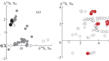 The sulfur isotopes and the total sulfur content were measured at the IDYST-UNIL laboratories using a Carlo Erba 1108 elemental analyzer connected to a Thermo Fisher (Bremen, Germany) Delta V Plus isotope ratio mass spectrometer that was operated in the continuous helium flow mode via a Conflo III split interface (Fig. 1b) [32]. The temperatures of the elemental analyzer reactor (packed as described earlier) and the gas chromatography (GC) oven were 1030 °C and 80 °C, respectively. The rate of carrier He through the reactor was set at 80 mL/min, and the rate of O2 flow was 30 mL/min. The combustion gases were dried by passing them through a glass tube (110 mm long, 10 mm ID, 12 mm OD) filled with 4 g of Mg(ClO4)2 flakes and then carried through a sulfur separation column (80 cm, 4 mm ID, 6 mm OG, PTFE) packed with Hayesep Q 80–100 mesh (Säntis Analytical, Teufen, Switzerland) for separation of gas components. The SO2 in the open split of the Conflo III was directed to the ion source of the IRMS for analysis of sulfur stable isotopes. The stable isotope composition of sulfur was reported in the delta (δ) notation as variation in the molar ratio of the heavy to light isotope [40] of sulfur (34S/32S) relative to the Vienna Cañon Diablo Troilite (VCDT) standard: