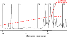 The ACE inhibition assay was performed according to a previously published method with some modifications [19]. Hippuryl-l-histidine-l-leucine (HHL, 5 mM) was dissolved in borate buffer (0.1 M containing 0.3 M NaCl, pH 8.3) and used as the substrate. Porcine lung ACE (~37 U mg−1) was diluted in borate buffer (0.1 M containing 0.3 M NaCl, pH 8.3) to a final activity of 100 U l−1. The substrate (75 μl) and sample or buffer (10 μl) were preincubated at 37 °C for 5 min. The reaction was started by the addition of ACE (5 μl) and stopped by the addition of HCl (1 M, 20 μl) after 30 min. The products hippuric acid (HA) and l-histidine-l-leucine (HL), which were released during hydrolysis, were separated by RP-C18 HPLC (SpectraSYSTEMS™, Thermo Scientific™, Dreieich, Germany) and detected at 228 nm. Solvent A consisted of 0.1 % (v/v) formic acid (FA) in double-distilled water. Solvent B consisted of 0.1 % (v/v) FA in acetonitrile (ACN). The elution of HA and HL was performed with a gradient and a constant flow rate of 0.5 ml min−1. The conditions of the gradient elution were as follows: 0 min (A: 100 %; B: 0 %), 20 min (A: 50 %; B: 50 %), 22 min (A: 50 %; B: 50 %), 28 min (A: 100 %; B: 0 %), 35 min (A: 100 %; B: 0 %). A reversed phase C18 HPLC column (Aqua 5u 200 Å, 150 mm × 4.6 mm, 5 μM; Phenomenex, Germany) equipped with a GROM-SIL 120 ODS-3 CP; 3 μM (20 mm × 4.6 mm) precolumn was used. Usually, 10 μl was injected in the HPLC. The IC50 was defined as the amount of hydrolysate or peptide required to reduce the area of the HA peak to 50 %.