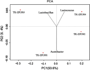 Bacterial diversity of Tibetan kefir grains from different areas in China was investigated by culture-independent metagenomic methods, and comprehensive taxonomic profiling was done. Eleven genera and their proportions were found in all the 4 samples, and they were Lactococcus (40.93–72.02 %), Lactobacillus (10.50–47.89 %), Acetobacter (4.50–14.15 %), Shewanella (1.73–7.58 %), Leuconostoc (0.64–0.84 %), Pseudomonas (0.07–0.63 %), Streptococcus (0.02–0.22 %), Acinetobacter (0.05–0.12 %), Pelomonas (0–0.01 %), Dysgonomonas (0–0.01 %), and Weissella (0–0.01 %). Shewanella, Acinetobacter, Pelomonas, Dysgonomonas, Weissella, and Pseudomonas were the first time found in Tibetan kefir grains. α-Diversity analysis showed that they varied in bacterial richness and diversity while β-diversity showed that the variation of genera composition among sampling sites was small. Principal component analysis showed that Lactobacillus, Lactococcus, and Acetobacter were the main genera which caused the diversity. This study provided theoretical basis for further investigation and application of Tibetan kefir grains.