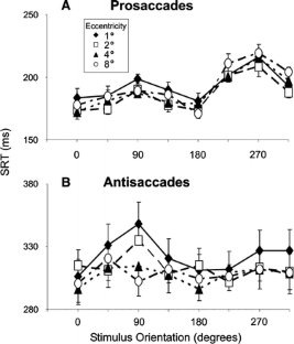 We examined the sensory and motor influences of stimulus eccentricity and direction on saccadic reaction times (SRTs), direction-of-movement errors, and saccade amplitude for stimulus-driven (prosaccade) and volitional (antisaccade) oculomotor responses in humans. Stimuli were presented at five eccentricities, ranging from 0.5° to 8°, and in eight radial directions around a central fixation point. At 0.5° eccentricity, participants showed delayed SRT and increased direction-of-movement errors consistent with misidentification of the target and fixation points. For the remaining eccentricities, horizontal saccades had shorter mean SRT than vertical saccades. Stimuli in the upper visual field trigger overt shifts in gaze more easily and faster than in the lower visual field: prosaccades to the upper hemifield had shorter SRT than to the lower hemifield, and more anti-saccade direction-of-movement errors were made into the upper hemifield. With the exception of the 0.5° stimuli, SRT was independent of eccentricity. Saccade amplitude was dependent on target eccentricity for prosaccades, but not for antisaccades within the range we tested. Performance matched behavioral measures described previously for monkeys performing the same tasks, confirming that the monkey is a good model for the human oculomotor function. We conclude that an upper hemifield bias lead to a decrease in SRT and an increase in direction errors.