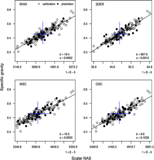 Near infrared diffuse reflectance was used for the determination of specific gravity in green Pinus taeda L. wood samples representing simulated increment cores obtained at breast height and merchantable green logs. The effects of using three pre-processing methods (second derivative, multiplicative scatter correction, and orthogonal signal correction) to reduce the scatter observed in the original spectra were evaluated. The effectiveness of each method was assessed in terms of the average predictive ability of the models and in terms of multivariate figures of merit derived from net analyte signal theory. Specific gravity was successfully modeled using green wood samples. No differences in predictive ability among models were found, although more parsimonious regressions were obtained using transformed spectra. The incorporation of figures of merit for the characterization of calibration models proved to be a valuable tool for understanding the effects of the pre-processing alternatives on the final results.