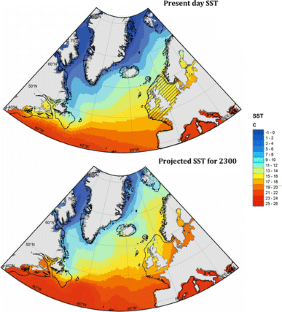 Climate change can have major effects on the distribution of species. In marine ecosystems, the cold waters of the Arctic have restricted warmer water species from crossing between Eurasia and North America. However, with Arctic waters becoming warmer, various marine species have expanded their distribution. Cuttlefish are fast-growing, voracious predators and are absent in American waters. The European cuttlefish Sepia officinalis is the most northerly distributed cuttlefish, with potential to expand its range and cross to the American continent, potentially causing changes in shelf food webs. Climate model predictions suggest that the S. officinalis could potentially reach American shores, by 2300 via the north Atlantic with medium mitigation of greenhouse gas concentrations; we predict that adult dispersal of cuttlefish across the Atlantic sector would require a migration distance of over 1400 km at depths below 200 m and temperatures above 7 °C (temperature below which cuttlefish can not maintain routine metabolic processes physiologically). For temperatures above 9.5 °C (temperature above which cuttlefish can grow), 2500 km would be required, and such conditions will possibly exist by the year 2300. If they reach American shores they could have large impacts on coastal marine ecosystems, due to their wide diet (e.g. diet covers many shallow-water crustacean and fish species) and its potential as prey, and due to their short life-history strategy of “live fast, die young”.