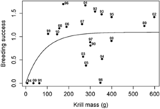 Fielding S, Watkins JL, Trathan PN, Enderlein P, Waluda CM, Stowasser G, Tarling GA, Murphy EJ (2014) Interannual variability in Antarctic krill (Euphausia superba) density at South Georgia, Southern Ocean: 1997–2013. ICES J Mar Sci. doi:10.1093/icesjms/fsu104
