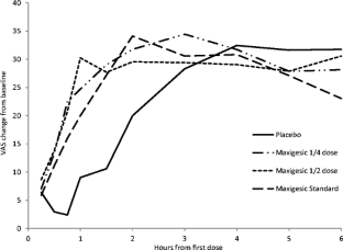 Data from 159 patients were included in the analysis. Mean (SD) time-adjusted SPID over 24 h were full-dose combination 20.1 (18.0), half dose combination 20.4 (20.8), quarter dose combination 19.3 (20.0) and placebo 6.6 (19.8). There was a significant overall effect of dose (p = 0.002) on the primary outcome. Planned pairwise comparisons showed that all combination dose groups were superior to placebo (full dose vs. placebo p = 0.004, half dose vs. placebo p = 0.002, quarter dose vs. placebo p = 0.002). The overall effect of dose was also significant for maximum VAS pain intensity score (p = 0.048), response rate (p = 0.0094), percentage of participants requiring rescue (p = 0.025) and amount of rescue (p < 0.001). No significant dose effect was found for time to peak reduction in VAS or time to meaningful pain relief. The majority of adverse events recorded were of mild (52.75 %) or moderate (40.16 %) severity and not related (30.7 %) or unlikely related (57.5 %) to the study medication.