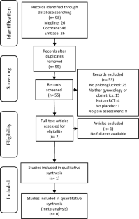 The keywords “phloroglucinol” and “randomised controlled trials” were used to search Medline, Embase and the Cochrane Library. We selected randomised, controlled against placebo trials testing the effect of phloroglucinol on gynaecologic or obstetrical pain either as a primary or secondary endpoint. We excluded trials exploring pain caused by intestinal, renal, metabolic or other causes and trials that were not available for critical review in either English or French. A quantitative synthesis (meta-analysis) was planned if the included trials were sufficiently homogenous. If this were not the case, a descriptive synthesis would be presented.